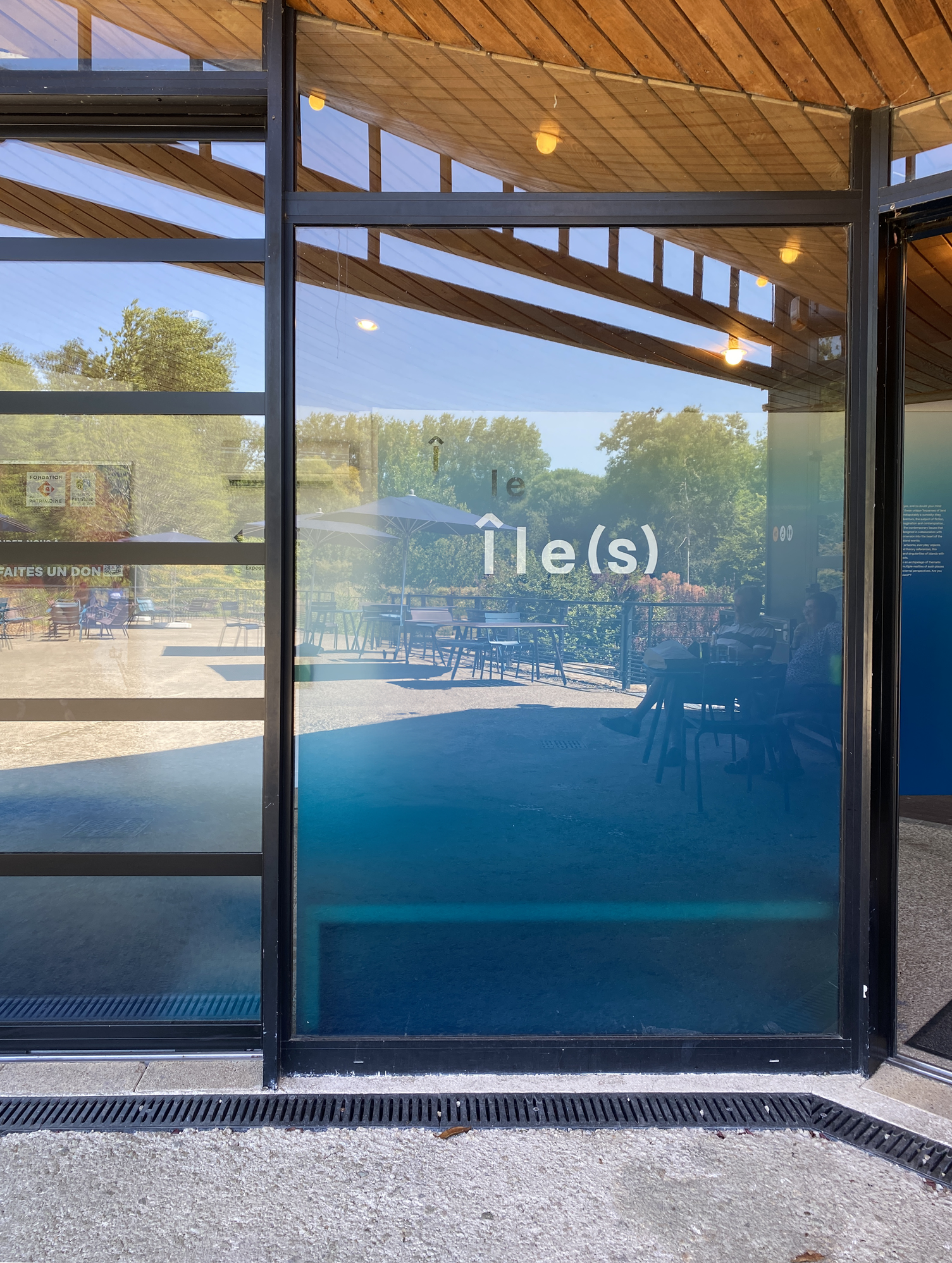 Le design de l'exposition a été pensé pour accompagner la scénographie, qui utilise des voiles pour structurer l'espace. Le graphisme se fond dans ce décor, créant un paysage aux dégradés bleus, comme une transition entre la mer et le ciel. La typographie, elle, sert de cartographie pour se repérer sur les différents "îlots" de l'exposition. Tout en légèreté, les impressions vaporeuses sur les voilages organisent les sections de façon harmonieuse.