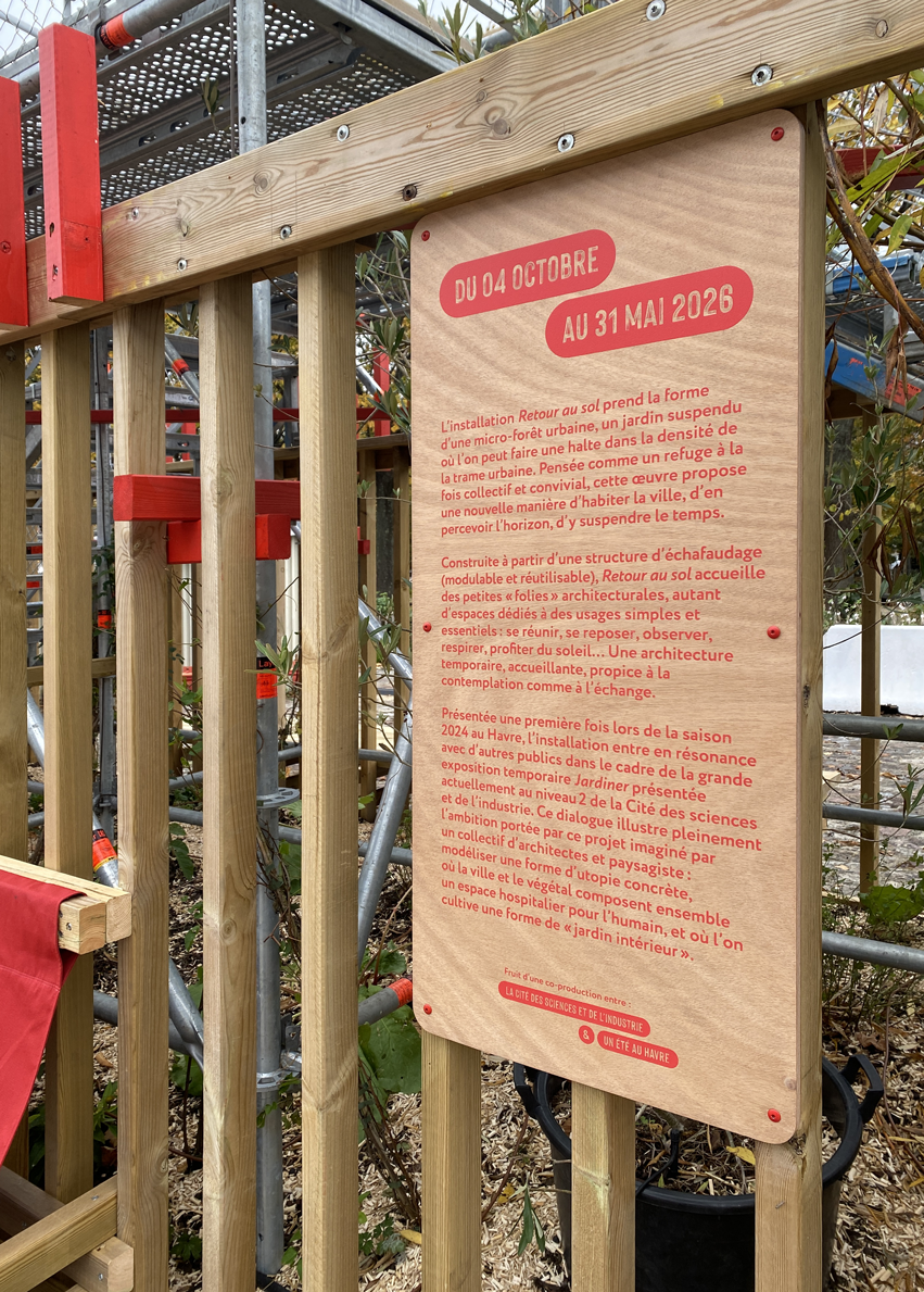 Pensée comme un refuge au cœur de la ville, Retour au sol est une micro-forêt urbaine, collective et conviviale. Un jardin suspendu où l’on peut se poser, faire une pause dans le rythme dense de la trame urbaine. Un espace pour réinventer notre rapport à la cité et à l’horizon.